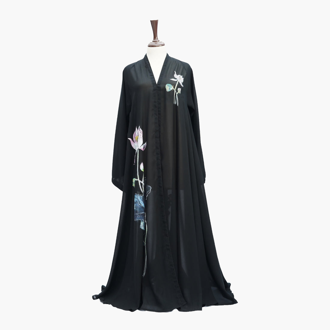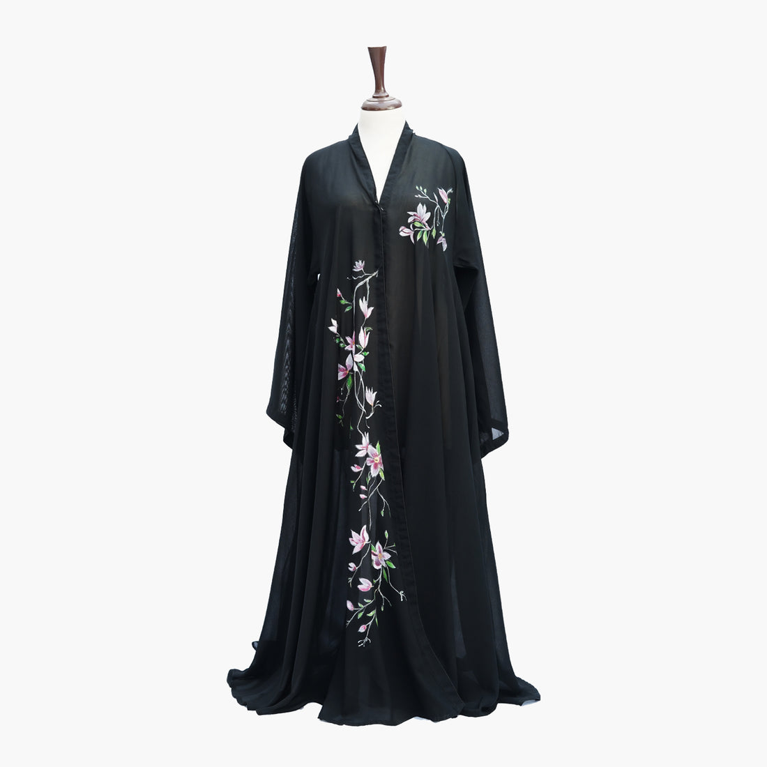 A hand-painted chiffon abaya with colorful flowers is a breathtaking fusion of elegance and artistry....