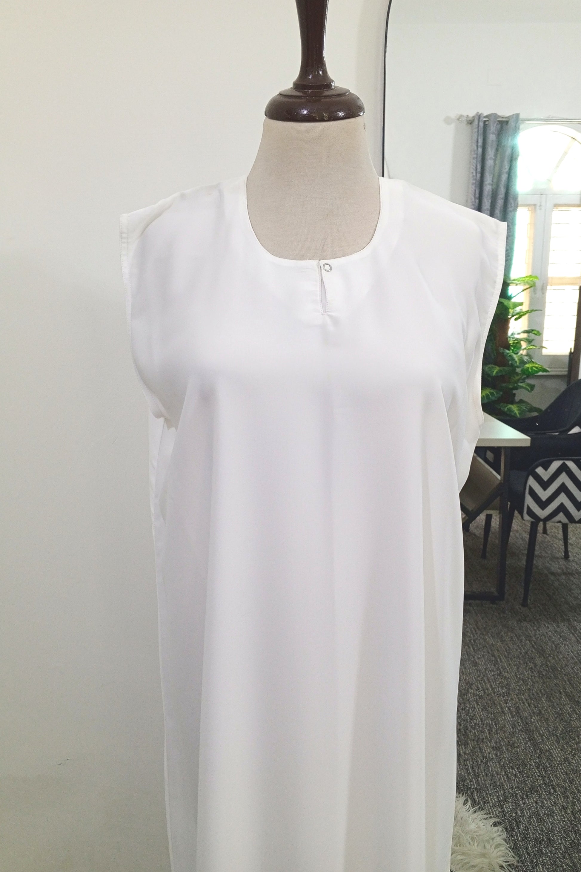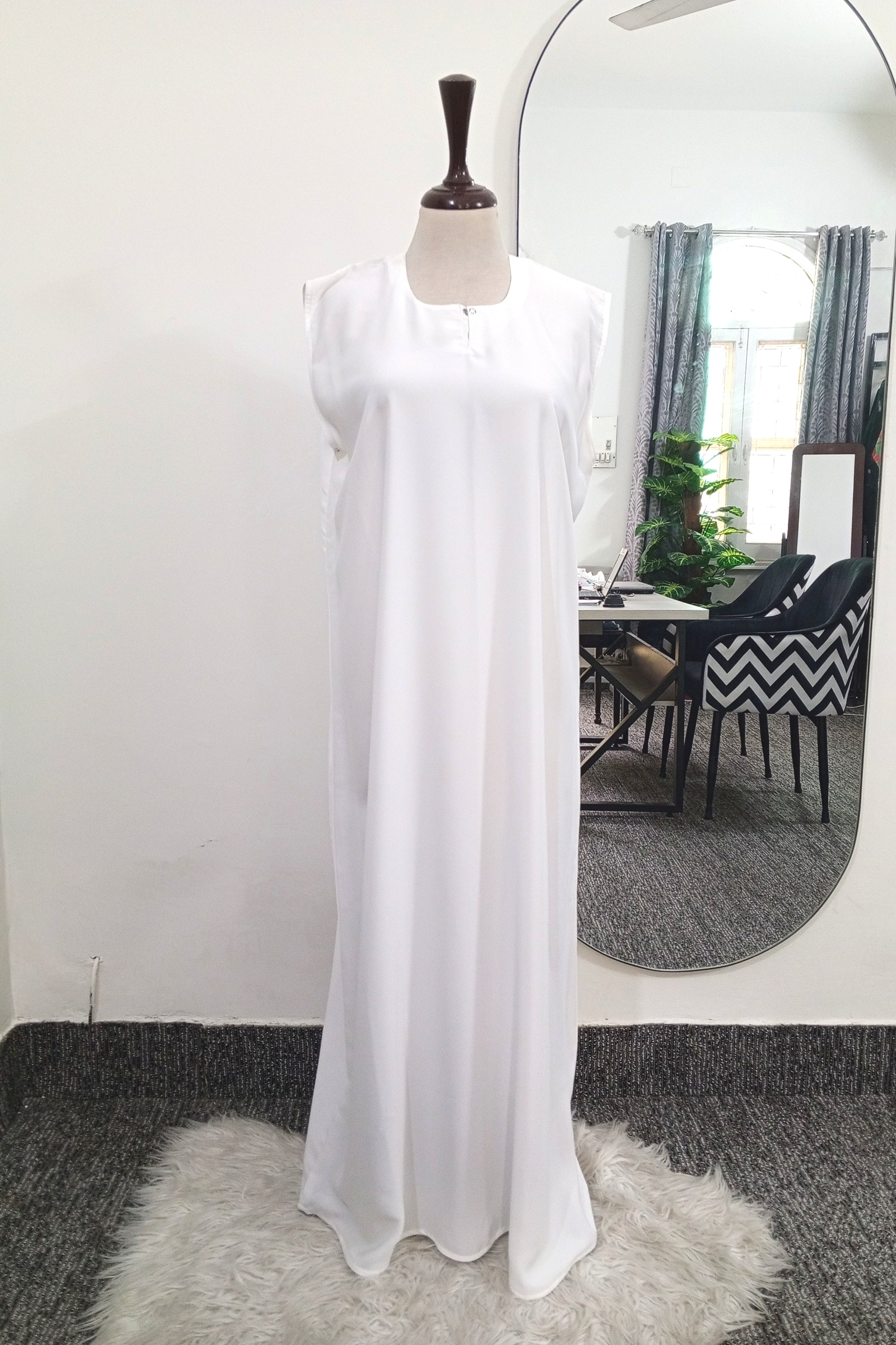An abaya inner sleeveless dress made from Nida fabric is designed to be worn comfortably beneath an abaya. Here’s a detailed description: