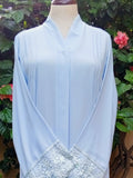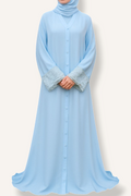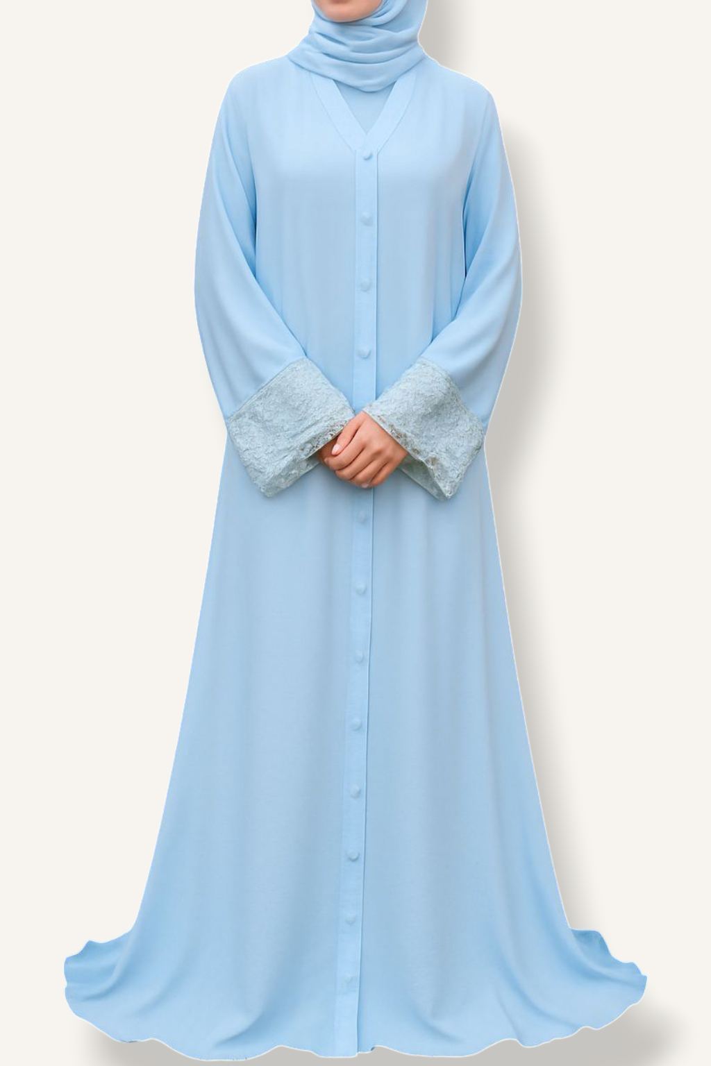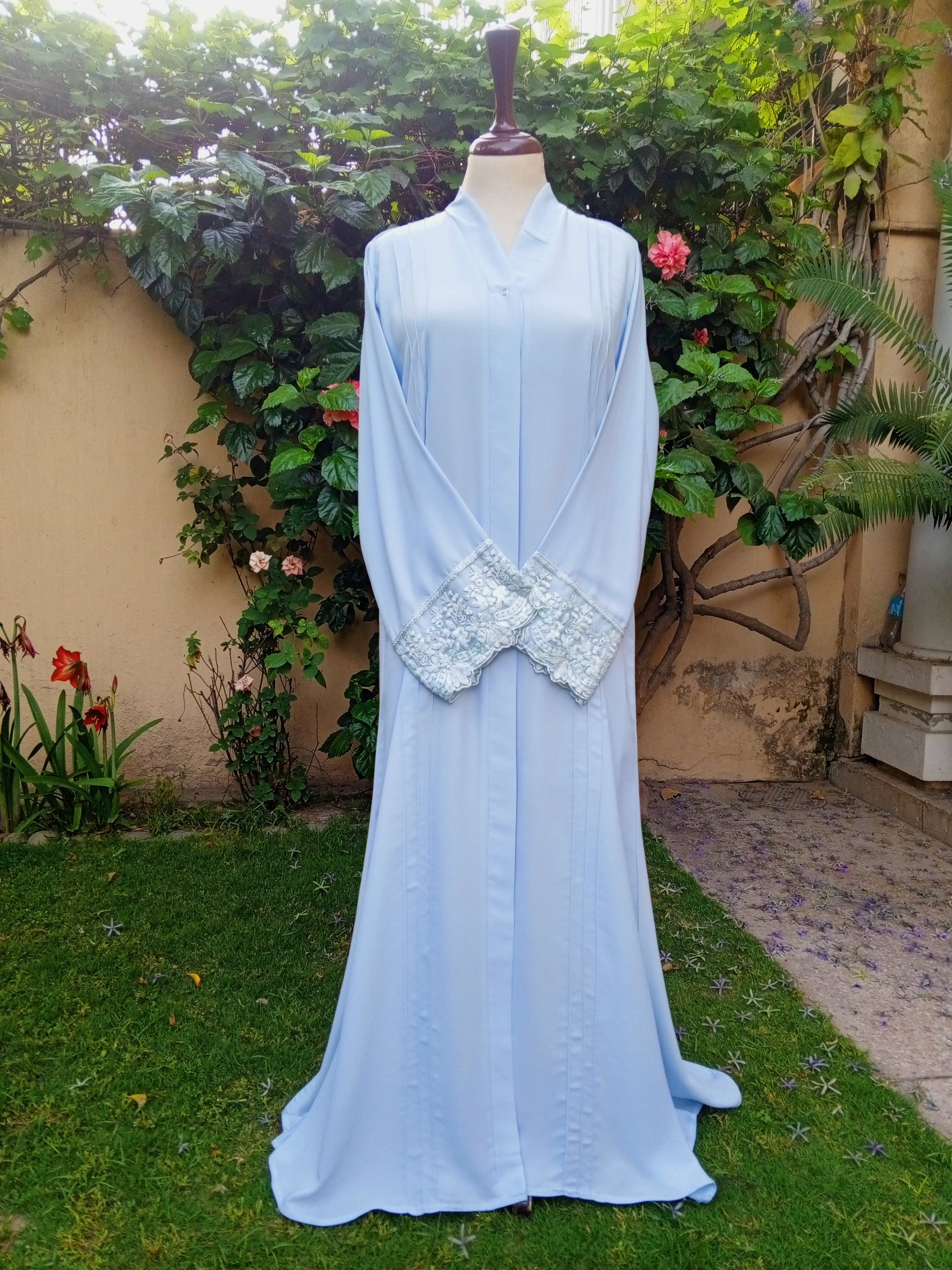 Inspired by the tranquility of the sky, this ethereal georgette abaya is a vision of grace. The soft sky-blue hue complements the intricate lacework on the sleeves, creating a dreamy and elegant silhouette.