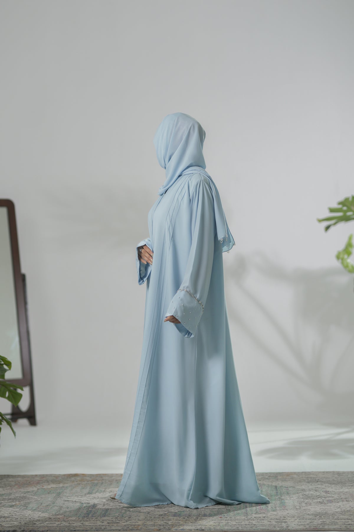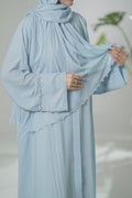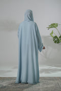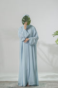 Celestial Grace captures the serenity of the sky in every fold. Crafted from premium georgette fabric, this front-open abaya features elegant pleats that create a soft, graceful flow with every movement.