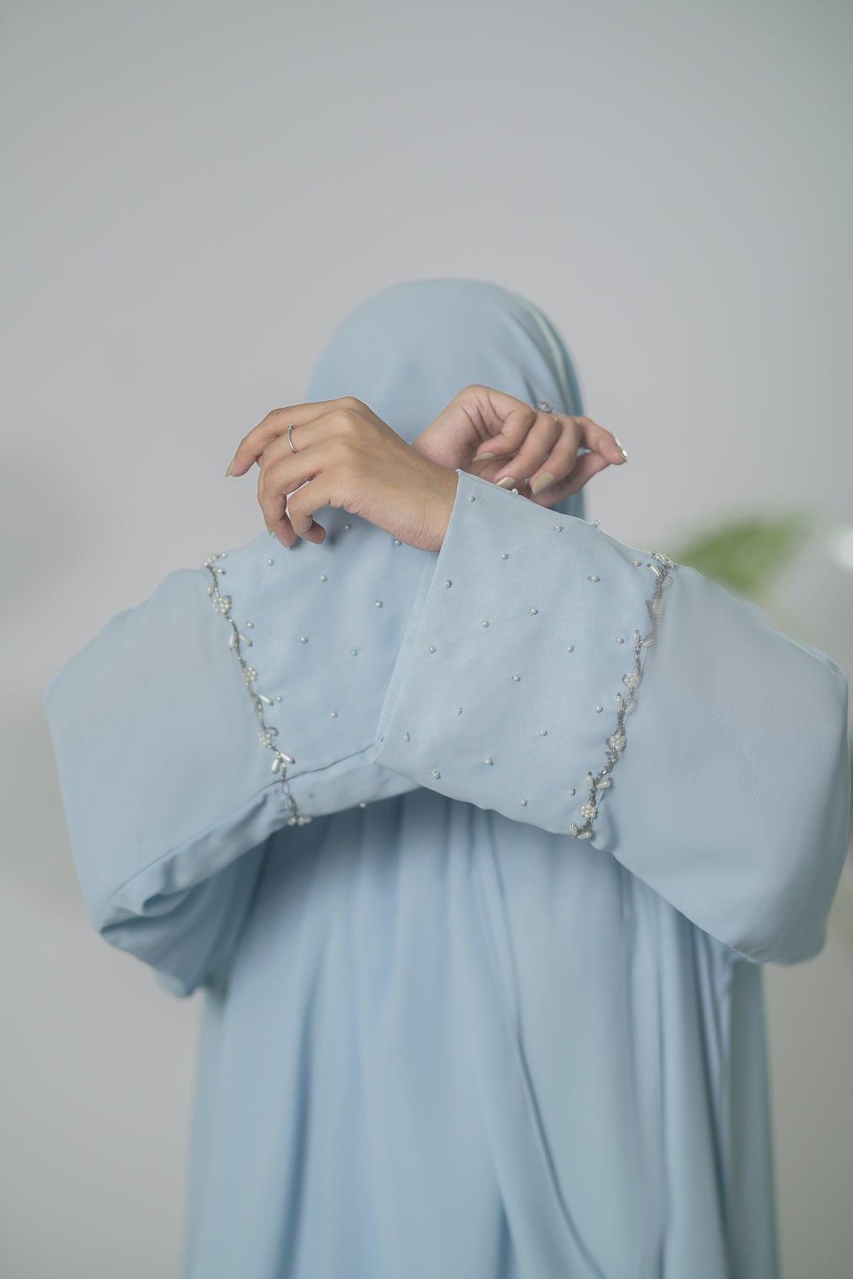 Delicate white pearls and shimmering beads are meticulously hand-embellished along the sleeves, adding a touch of sophistication and gentle radiance. The look is completed with a matching sky-blue scarf, adorned with pearls on one side, enhancing its refined and feminine appeal.