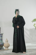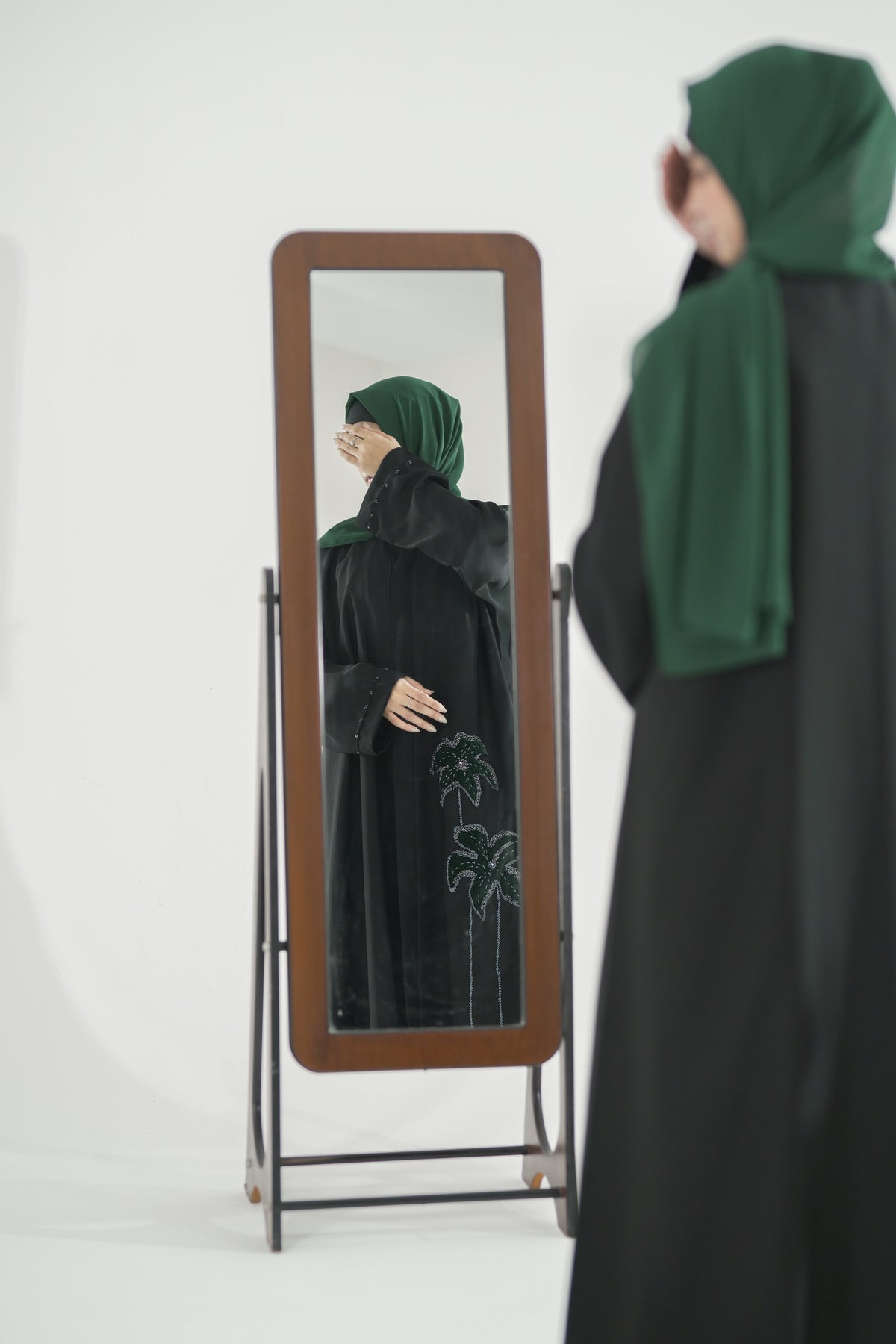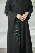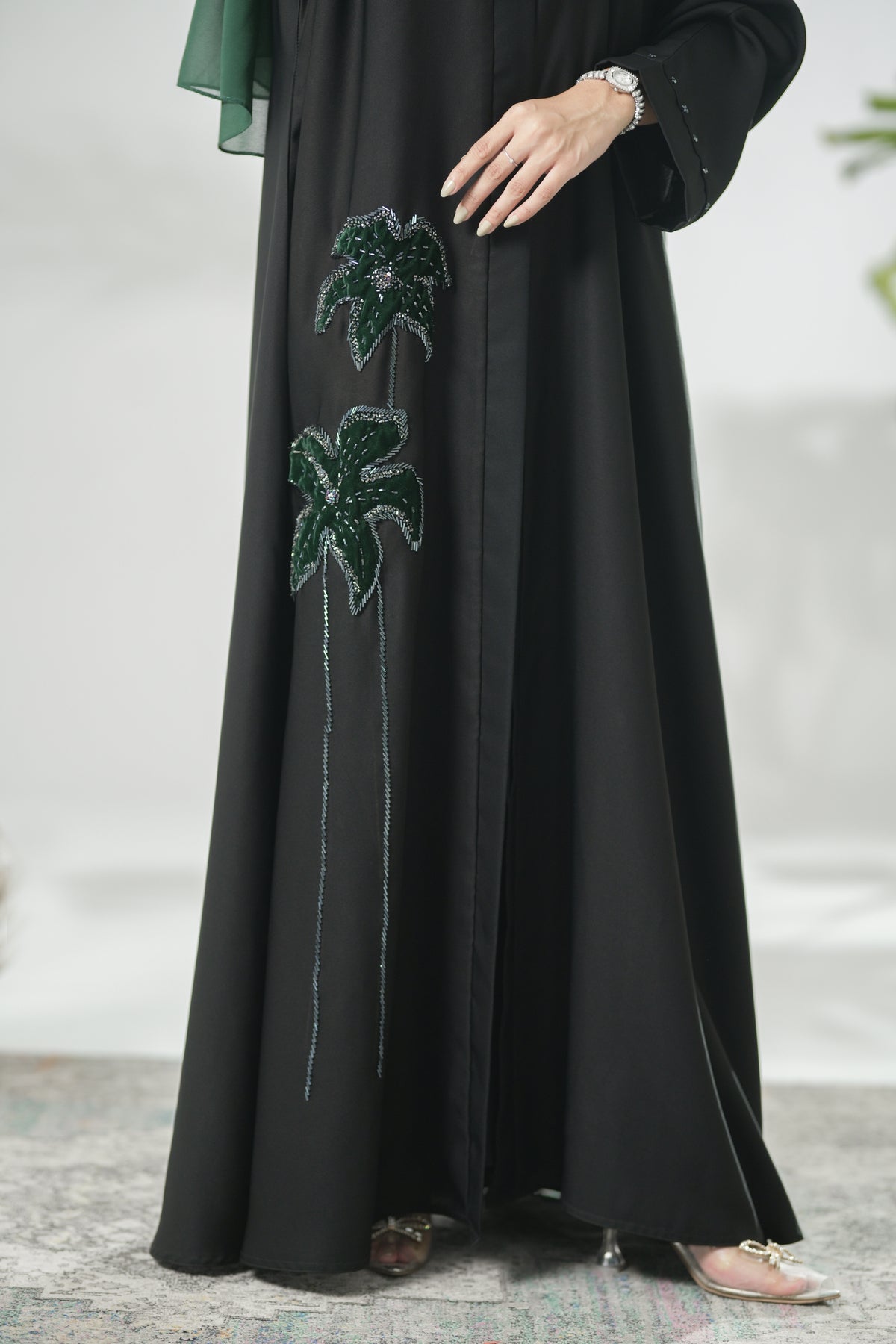 Embrace timeless sophistication with Emerald Palm, a stunning black abaya crafted from premium Nida fabric for a graceful drape and ultimate comfort. Adorned with exquisite velvet floral appliqué motifs and hand-embellished beadwork, this masterpiece reflects a perfect blend of artistry and modern elegance.