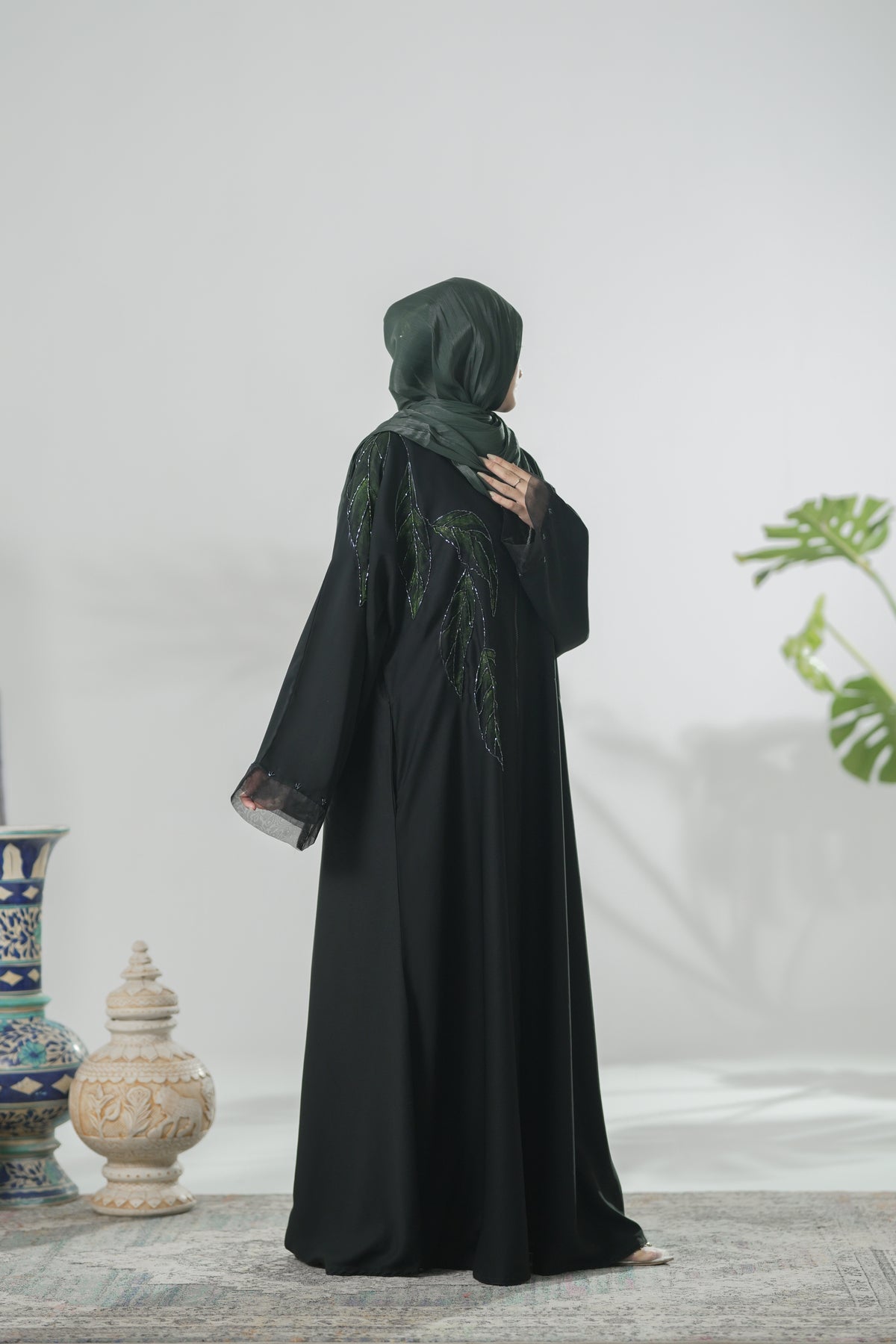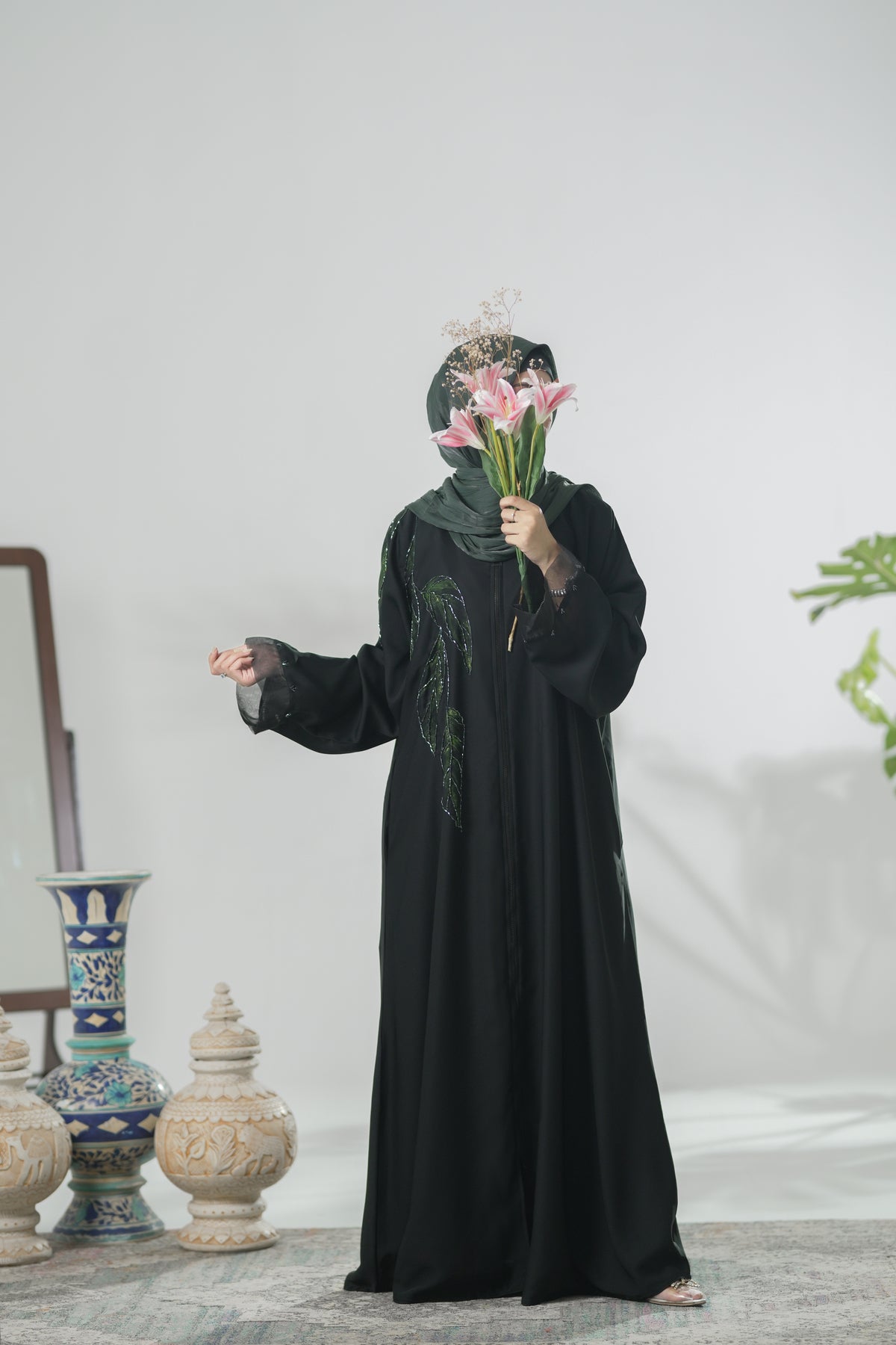 The light embellishments on the sleeves shimmer beautifully under soft light, making it an ideal choice for semi-formal gatherings, evening wear, or graceful day events. With its fluid drape and meticulous hand detailing, Emerald Whispers captures the essence of classic modesty infused with modern refinement — a reflection of calm confidence and timeless beauty.
