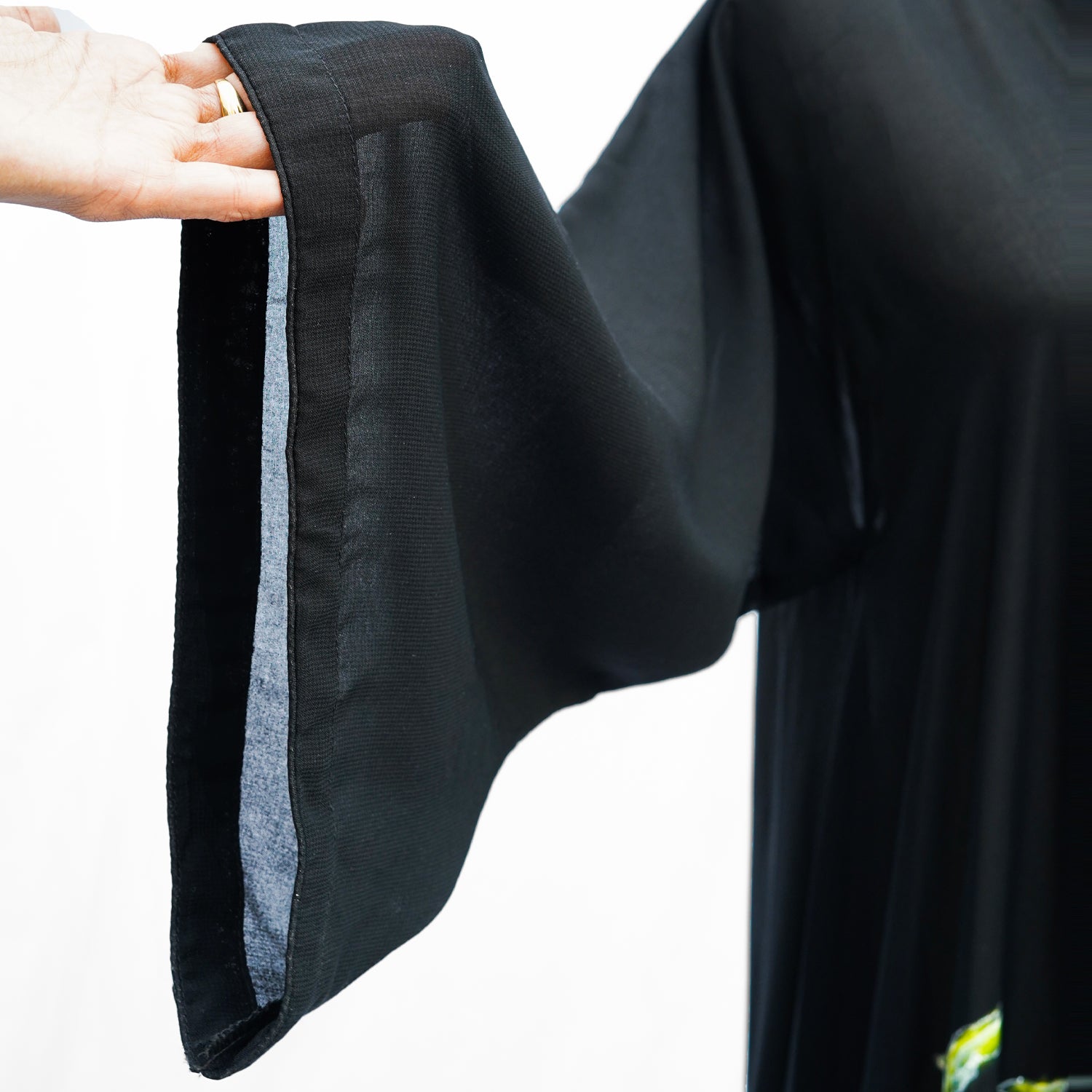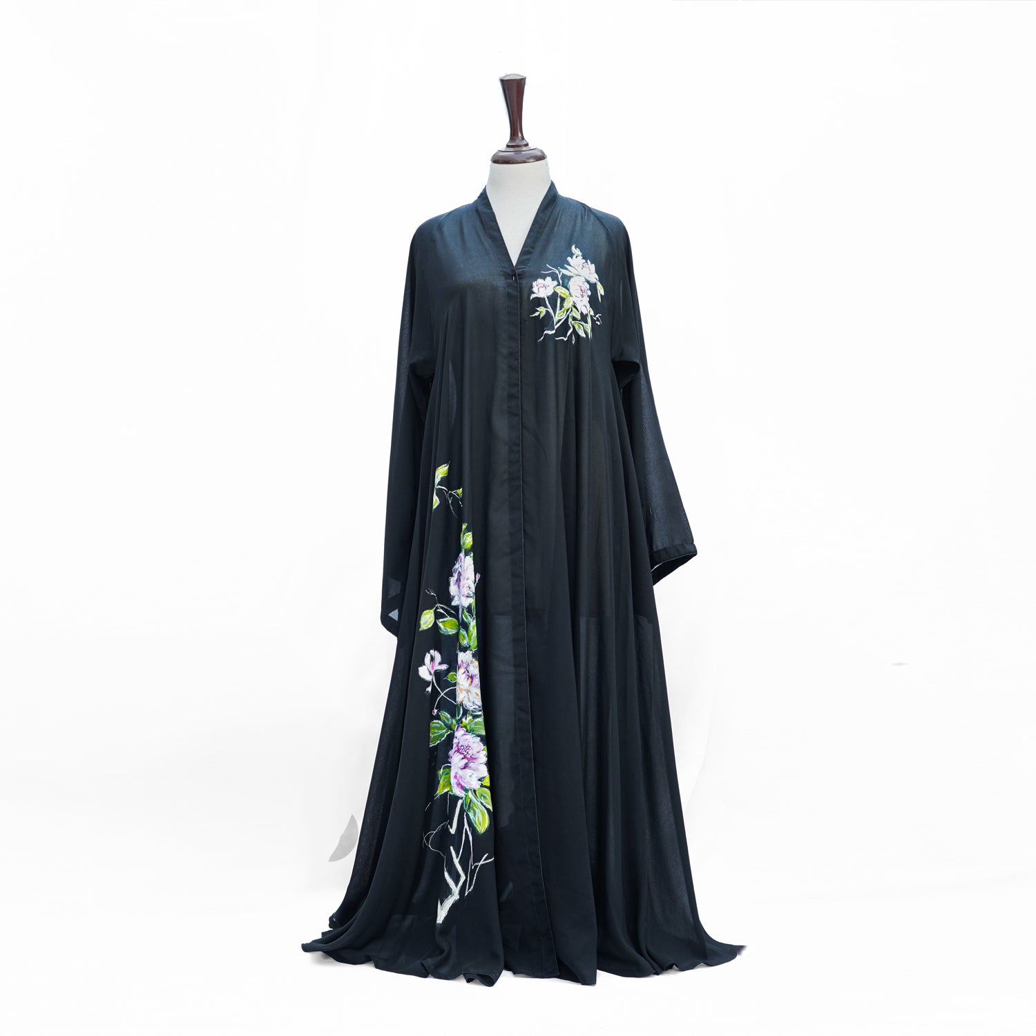 A hand-painted chiffon abaya with colorful flowers is a breathtaking fusion of elegance and artistry. Crafted from delicate, airy chiffon, this abaya drapes gracefully, creating a flowy and ethereal silhouette. The hand-painted floral motifs burst with vibrant hues—flowers in deep crimson, and in soft pink—each brushstroke adding a unique, artisanal touch. The intricate detailing of the petals and leaves brings a lifelike charm, making the abaya a wearable piece of art. Whether worn casually or for special occasions, this abaya exudes sophistication, femininity, and a timeless appreciation for handcrafted beauty.