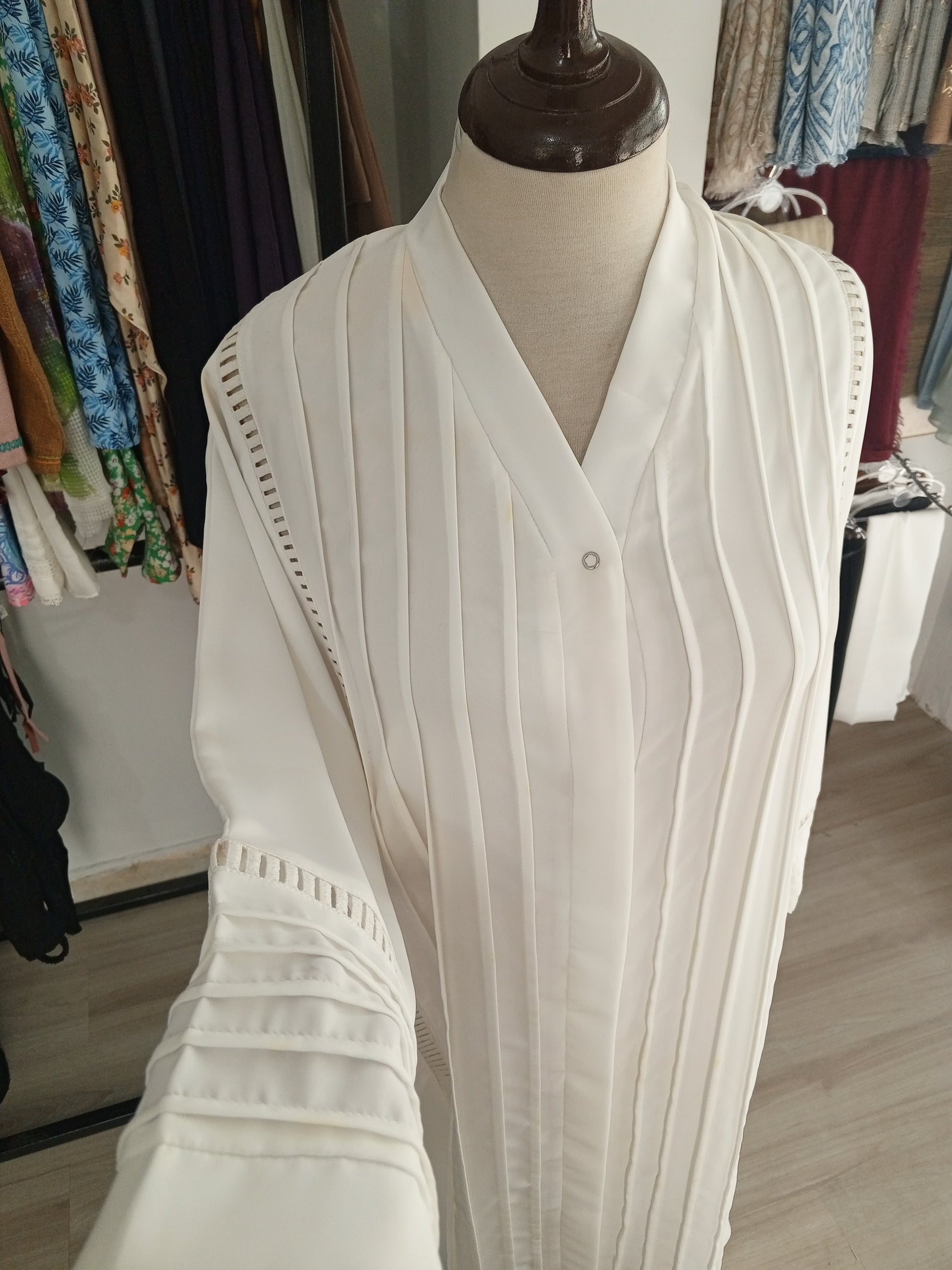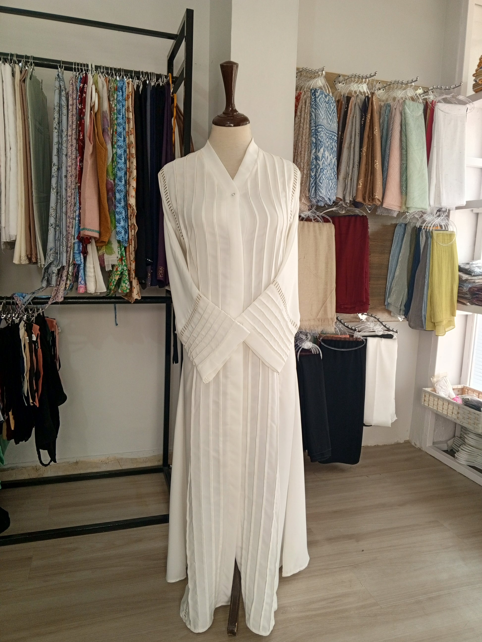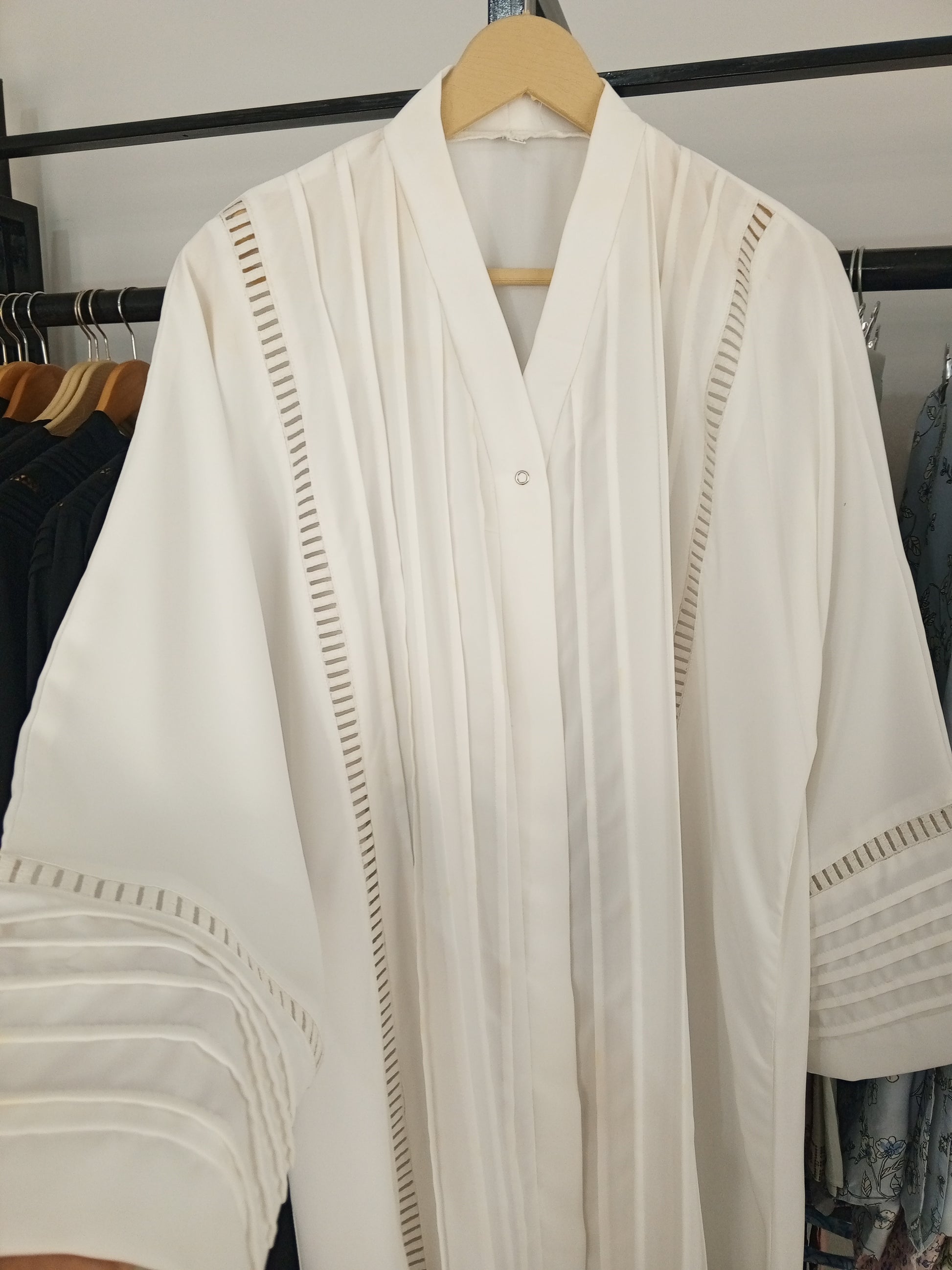 Hand wash or use a delicate cycle on the washing machine. Use a mild detergent with cool water for washing. To wash in a machine use a mesh bag for abayas protection . Dry by hanging it on a clothesline or drying rack in a well-ventilated area. Do not use cloth dryer