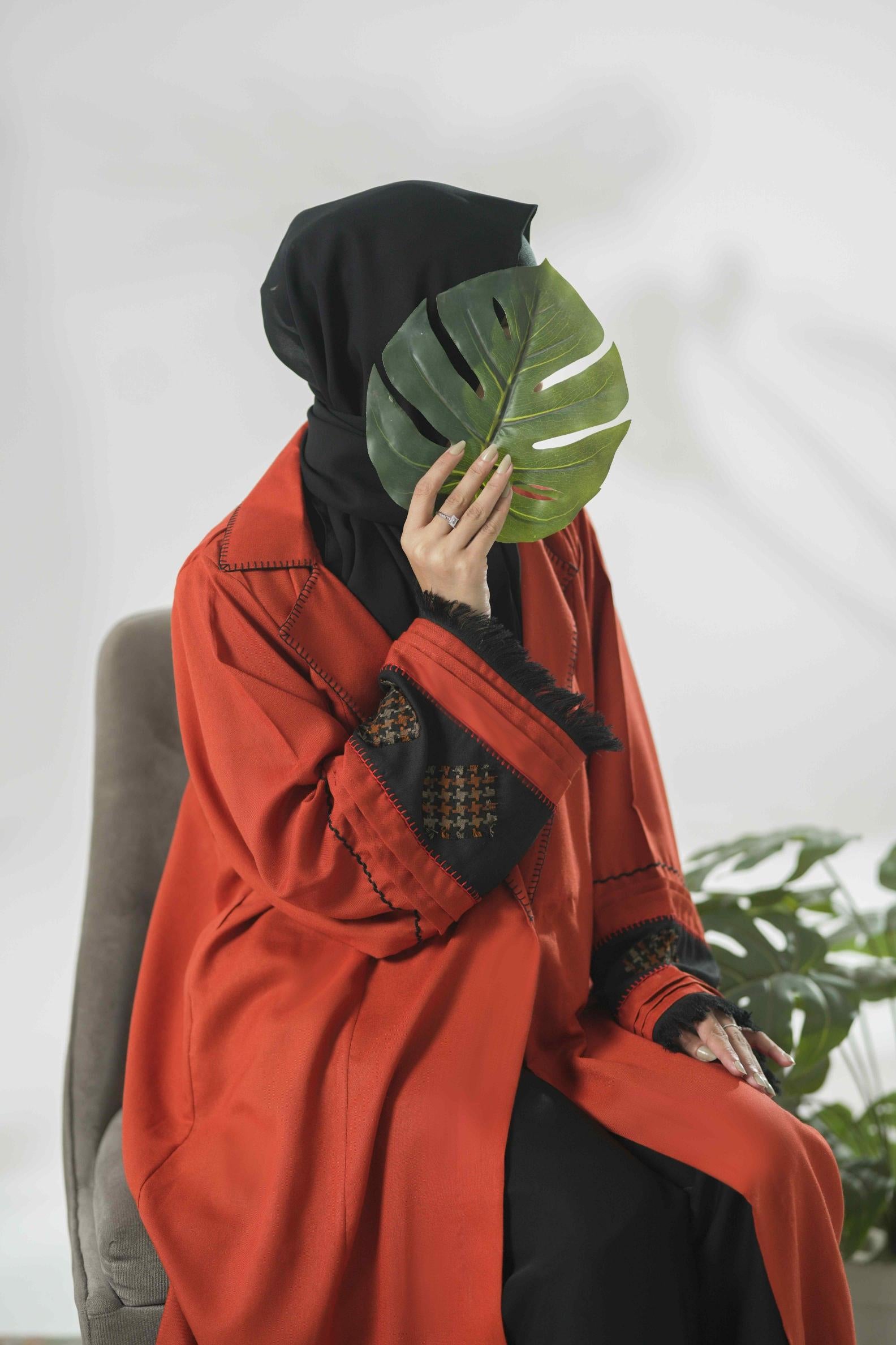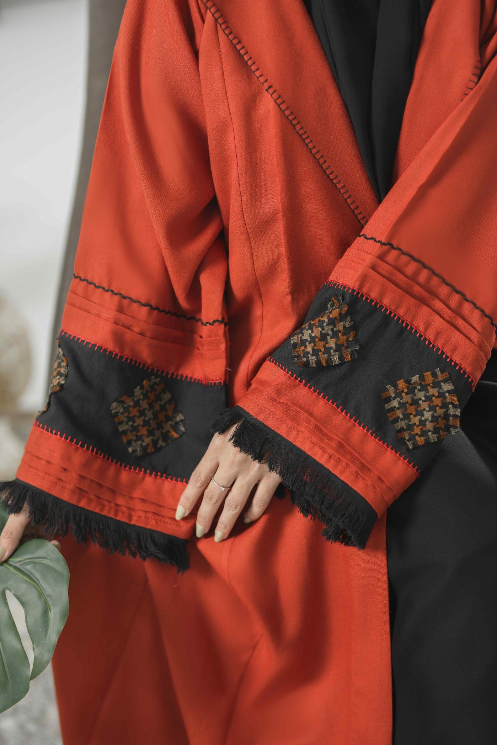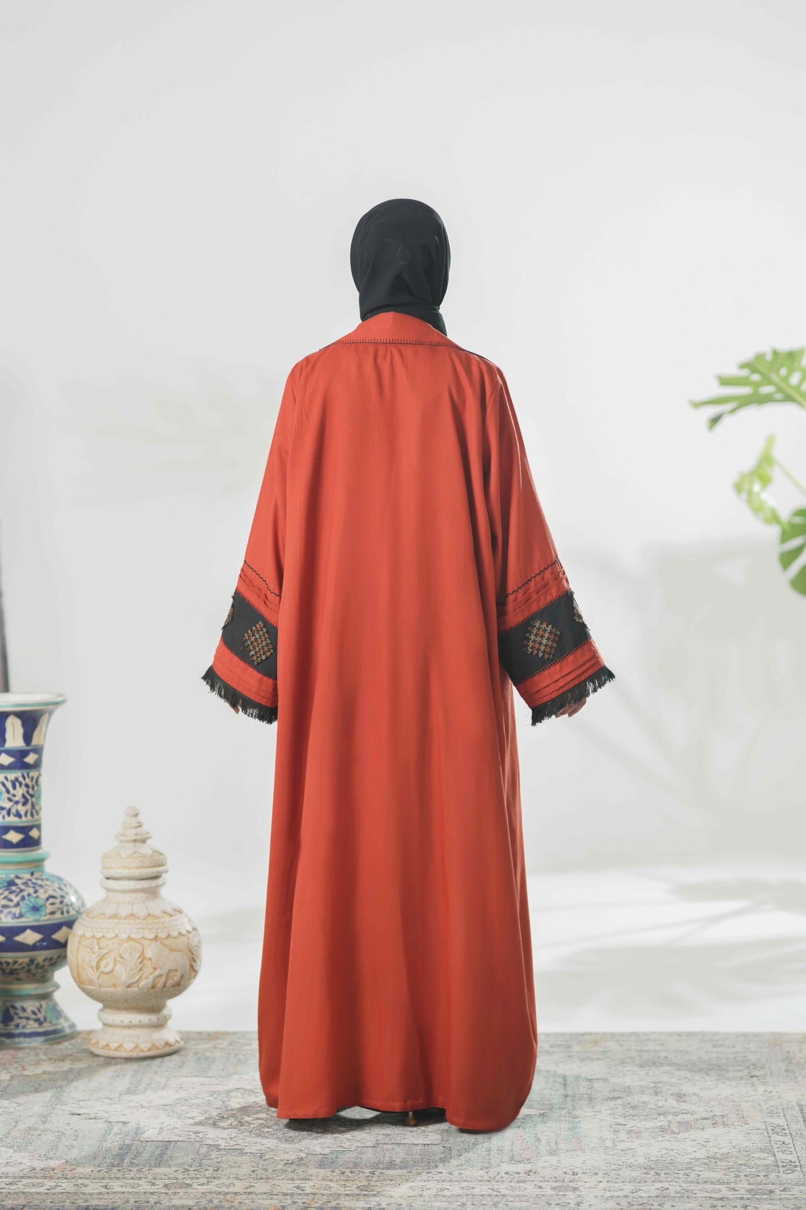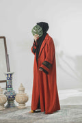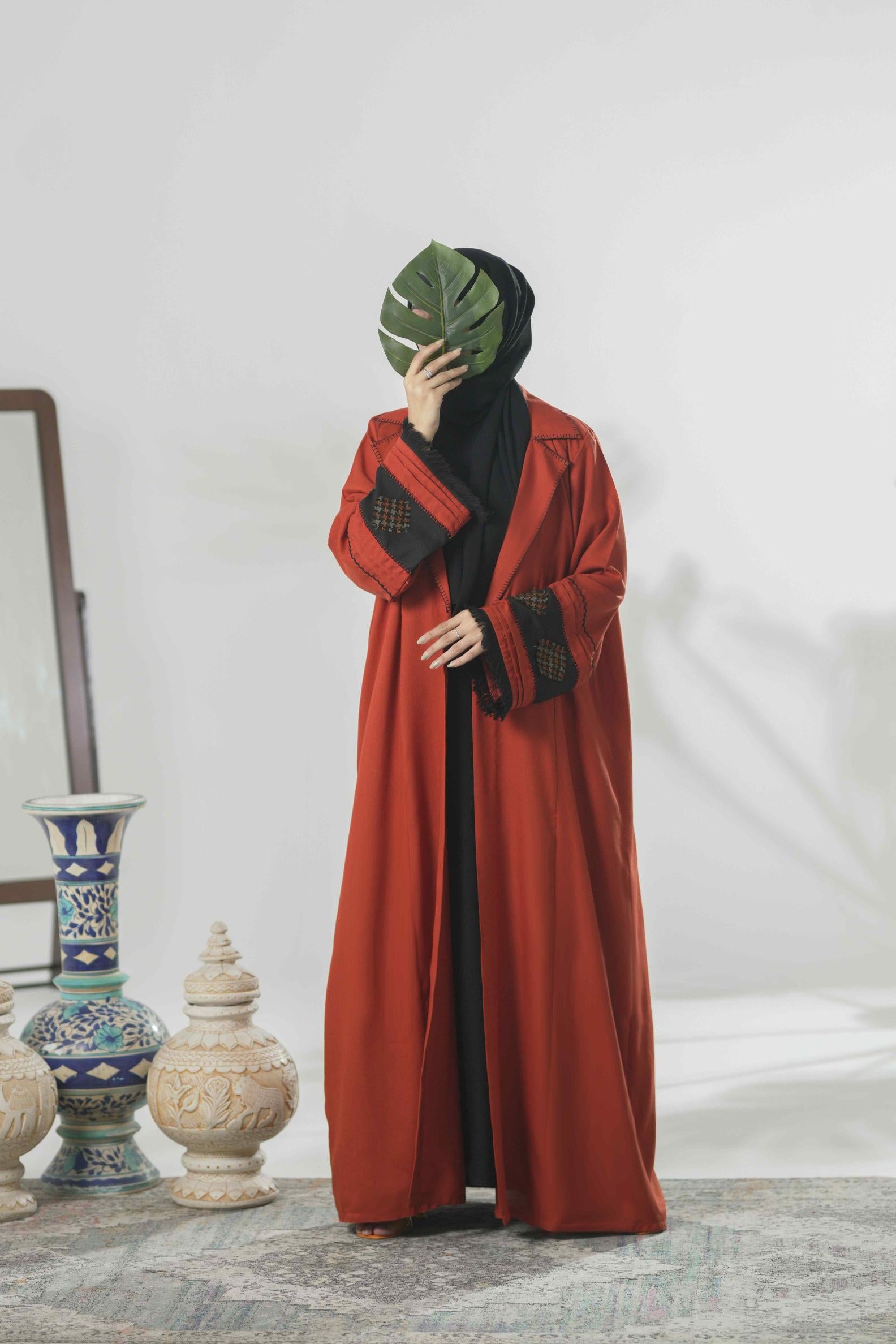 Wrap yourself in timeless elegance with Rust Aura, a coat-style abaya crafted from soft marina fabric, perfect for the winter season. The rich rust hue exudes warmth and sophistication, while the hand embroidery and patchwork detailing on the sleeves and collar add a refined designer touch.